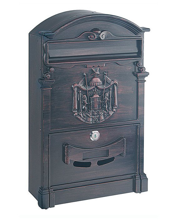 Metalowa skrzynka pocztowa z motywem antycznym, do użytku wewnątrz i na zewnątrz, otwierana od przodu. Wysokość 410 x szerokość 260 x głębokość 90 mm.