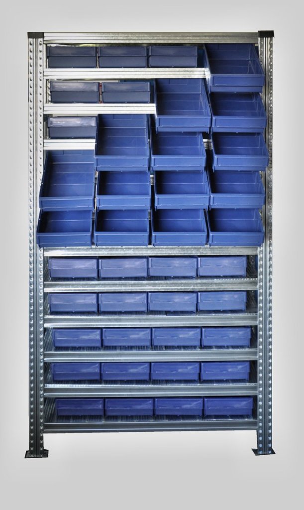 Bezśrubowy metalowy regał ze skrzyniami stojakowymi. 12 półek, nośność 125 kg, nośność kolumny 1100 kg. Wymiary półki wys. 1972 x szer. 1124 x gł. 610 mm. Zawiera 24 szt. skrzynek z półkami wys. 100 x szer. 230 x gł. 600 mm i 40 szt. skrzynek z półkami wys. 100 x szer. 115 x gł. Gwarancja 2 lata.