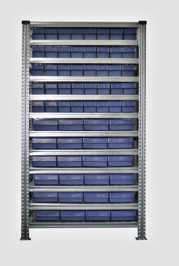 Bezśrubowy metalowy regał ze skrzyniami plastikowymi. 12 półek, nośność 125 kg, nośność kolumny 1100 kg. Wymiary półki wys. 1972 x szer. 1124 x gł. 330 mm. Zawiera 24 szt. skrzynek z półkami wys. 100 x szer. 230 x gł. 300 mm i 40 szt. skrzynek z półkami wys. 100 x szer. 115 x gł. Gwarancja 2 lata.