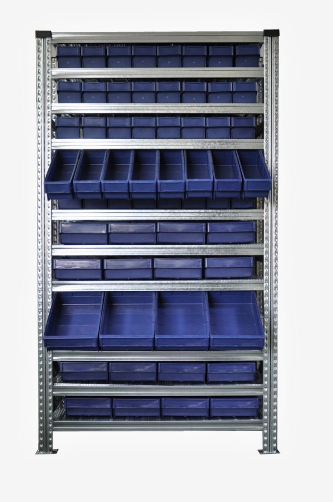 Bezśrubowy metalowy regał ze skrzyniami plastikowymi. 12 półek, nośność 125 kg, nośność kolumny 1100 kg. Wymiary półki wys. 1972 x szer. 1124 x gł. 330 mm. Zawiera 24 szt. skrzynek z półkami wys. 100 x szer. 230 x gł. 300 mm i 40 szt. skrzynek z półkami wys. 100 x szer. 115 x gł. Gwarancja 2 lata.