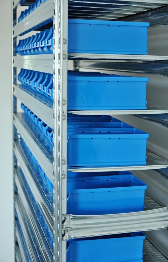 Bezśrubowy regał metalowy z plastikowymi pudełkami. 15x półek, nośność 125 kg, nośność kolumny 1100 kg. Wymiary półki wys. 1972 x szer. 1124 x gł. 330 mm. Zawiera 70x plastikowe pudełko 456232 i 70x plastikowe pudełko 456230. Gwarancja 2 lata.