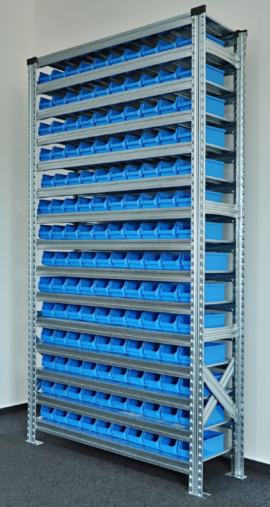 Bezśrubowy regał metalowy z plastikowymi pudełkami. 15x półek, nośność 125 kg, nośność kolumny 1100 kg. Wymiary półki wys. 1972 x szer. 1124 x gł. 330 mm. Zawiera 140 sztuk plastikowego pudełka 456231. Gwarancja 2 lata.