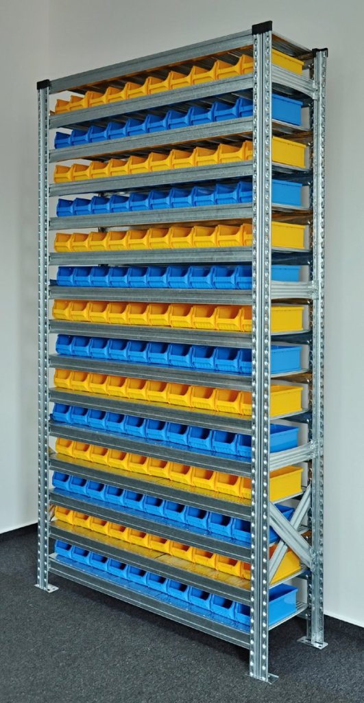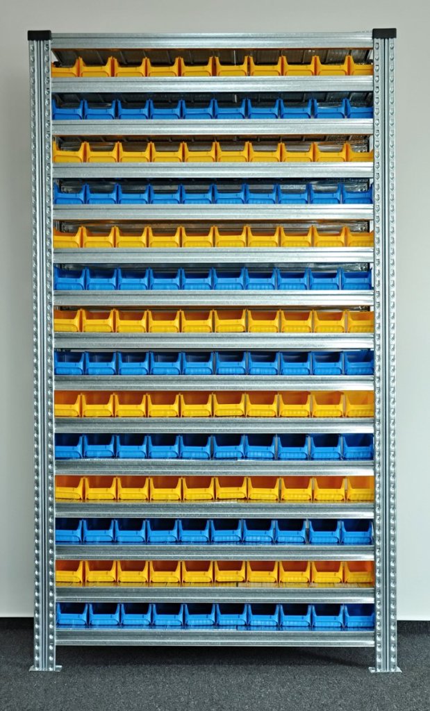 Bezśrubowy regał metalowy z plastikowymi pudełkami. 15x półek, nośność 125 kg, nośność kolumny 1100 kg. Wymiary półki wys. 1972 x szer. 1124 x gł. 330 mm. Zawiera 140 sztuk plastikowego pudełka 456232. Gwarancja 2 lata.