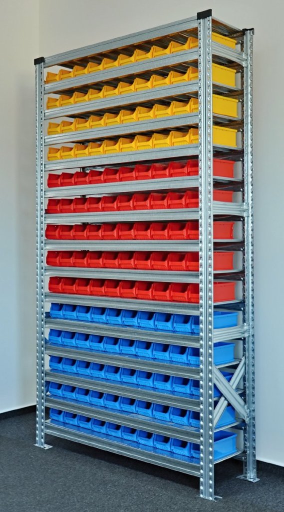Bezśrubowy regał metalowy z plastikowymi pudełkami. 15x półek, nośność 125 kg, nośność kolumny 1100 kg. Wymiary półki wys. 1972 x szer. 1124 x gł. 330 mm. Zawiera 140 sztuk plastikowego pudełka 456232. Gwarancja 2 lata.