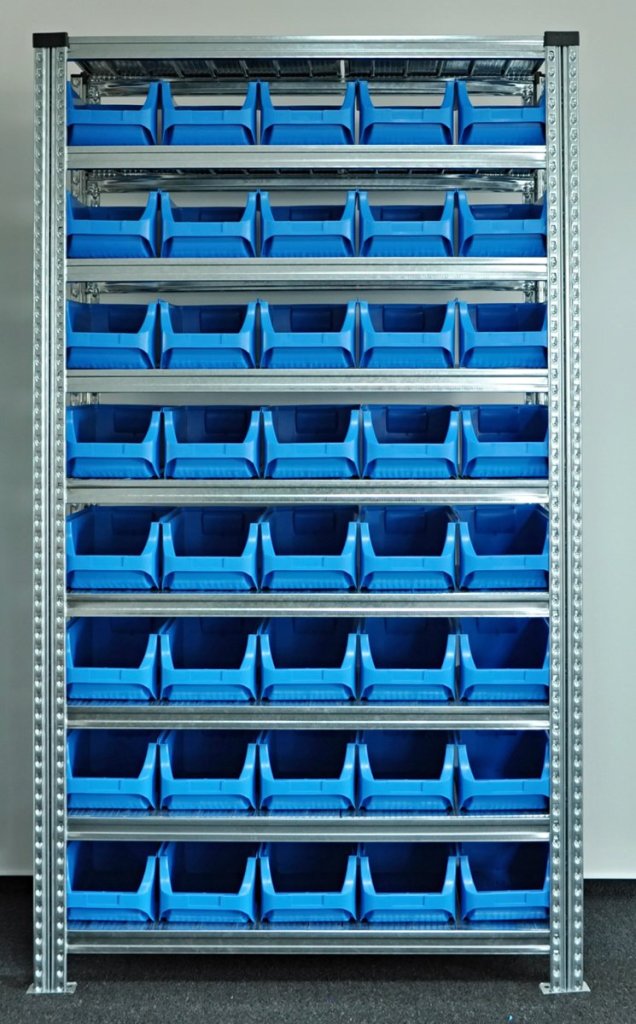 Bezśrubowy regał metalowy z plastikowymi pudełkami. 9x półek, nośność 125 kg, nośność kolumny 1100 kg. Wymiary półki wys. 1972 x szer. 1124 x gł. 410 mm. Zawiera 40 sztuk plastikowego pudełka 456213. Gwarancja 2 lata.