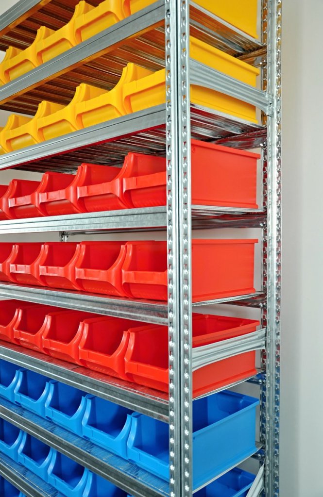 Bezśrubowy regał metalowy z plastikowymi pudełkami. 9x półek, nośność 125 kg, nośność kolumny 1100 kg. Wymiary półki wys. 1972 x szer. 1124 x gł. 410 mm. Zawiera 40 sztuk plastikowego pudełka 456213. Gwarancja 2 lata.