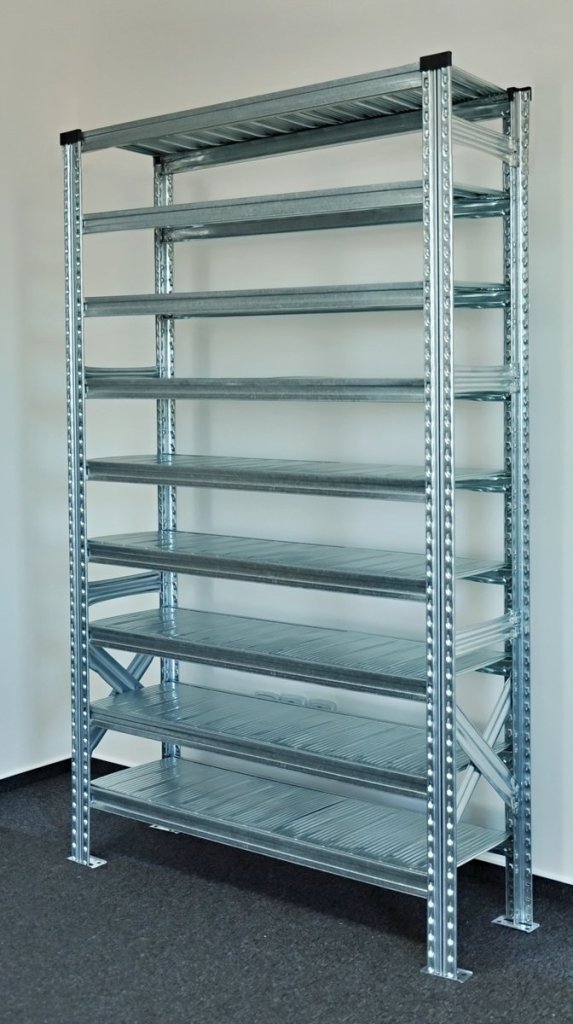 Regał półkowy bez śrub. 9 półek, nośność 125 kg. Wymiary wys. 1972 x szer. 1124 x gł. 410 mm.