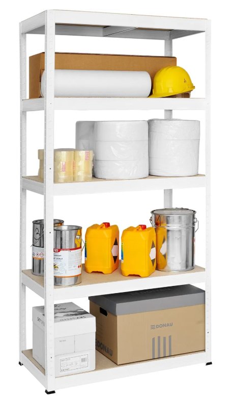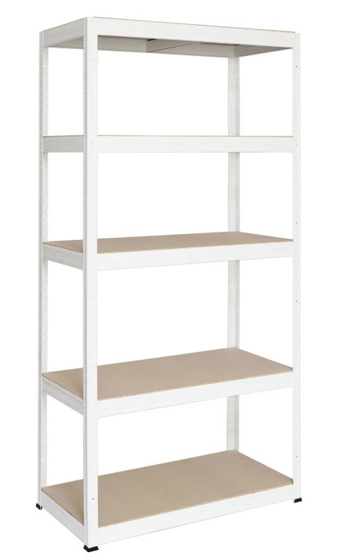 Regał uniwersalny, montaż bezśrubowy. Wysokość regału 1800 x szerokość 900 x głębokość 450 mm, 5 półek ze wzmocnieniem, nośność 200 kg. Wersja w kolorze białym.