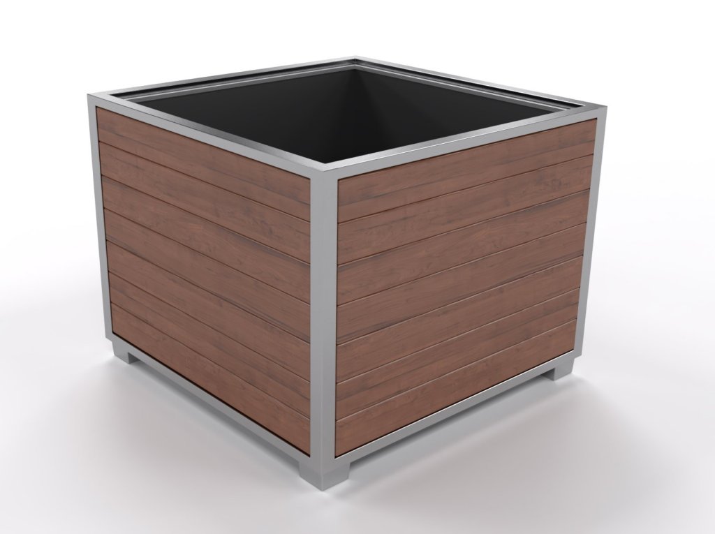 Duża donica o konstrukcji stalowej, poszycie z desek litego świerku, pojemnik wewnętrzny z blachy ocynkowanej. Wysokość 850 x szerokość 1000 x głębokość 1000 mm.
