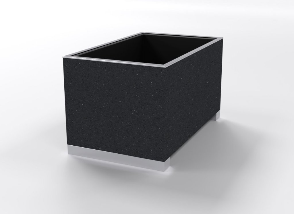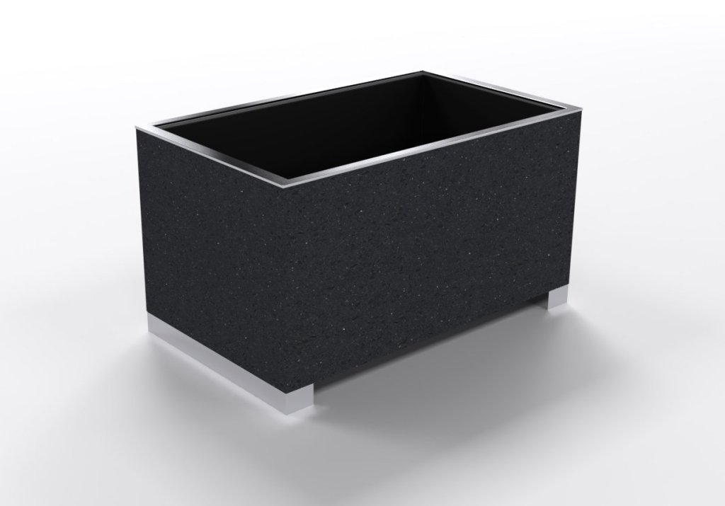 Duża doniczka o konstrukcji stalowej, obudowa blaszana malowana farbą piecową, pojemnik wewnętrzny wykonany z blachy ocynkowanej. Wysokość 700 x szerokość 600 x głębokość 1000 mm.