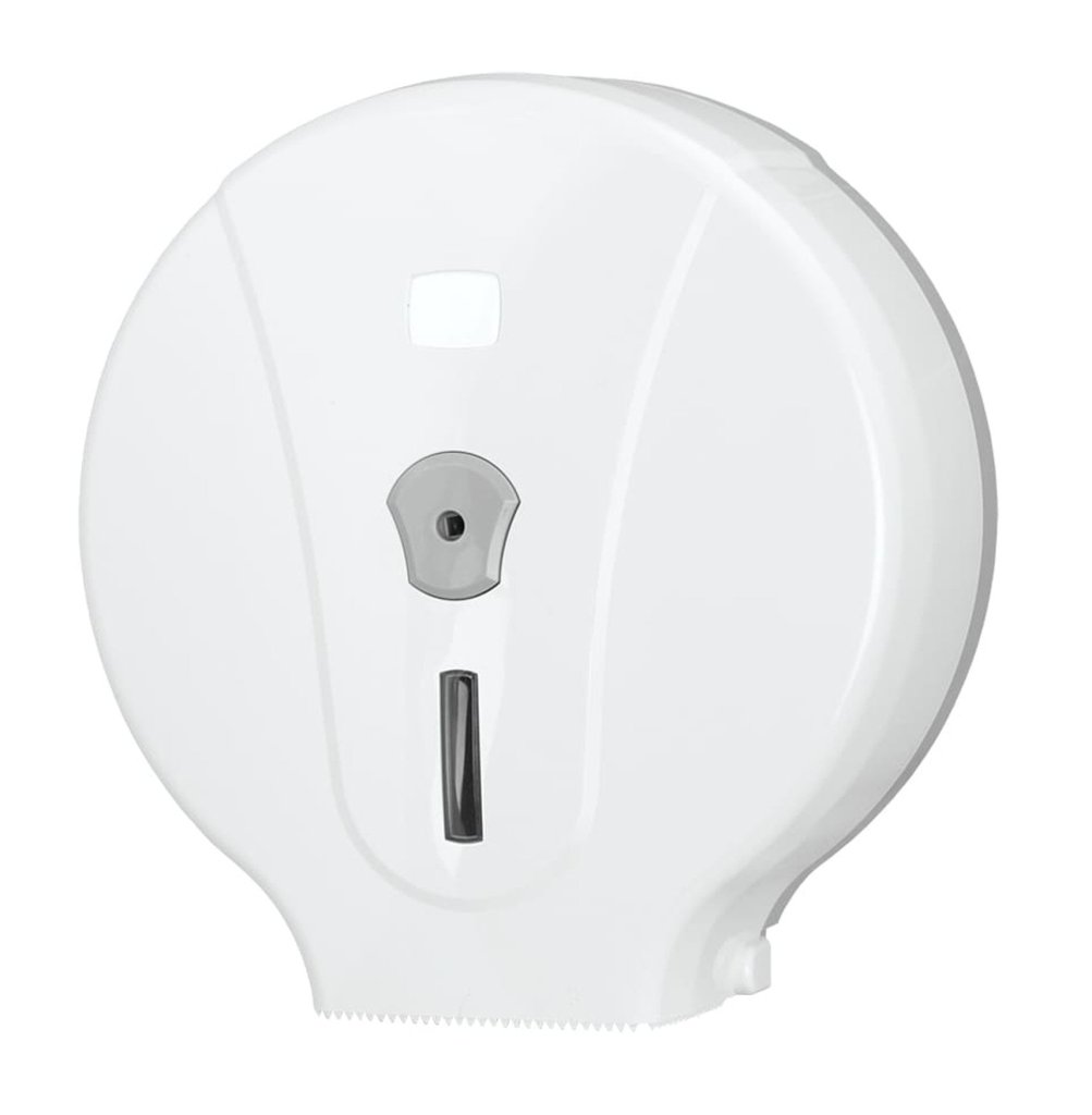 Plastikowy dozownik do papieru toaletowego Jumbo Maxi (maksymalna średnica środkowa 29,5 cm). Widok do sprawdzania stanu papieru, zamykany.