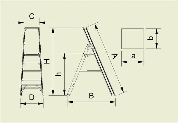 Drabina aluminiowa jednostronna Eurostyle, ilość stopni łącznie z podestem 1x3, wymiary podestu 264 x 262 mm, maksymalna wysokość podestu 0,59 m, szerokość stopni 412 mm. Nośność 150 kg. Schody 913, 914 - w magazynie.