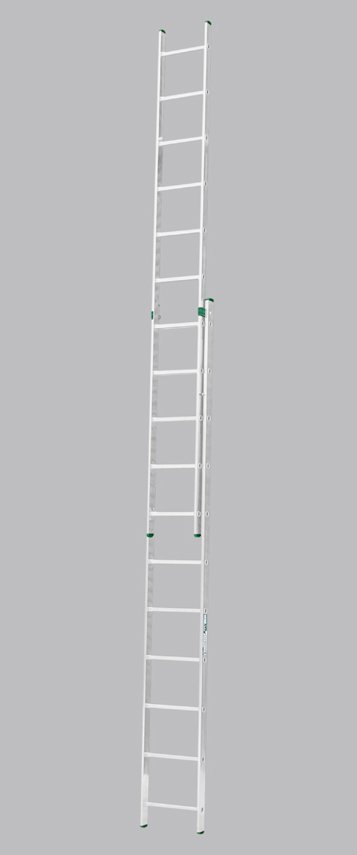 Dwuczęściowa drabina rozkładana Eurostyle. Ilość przegród 2x16, max długość rozsuwana 7,66m, szerokość 397mm, końcówki zielono-czarne. Drabiny te są wykonane z lekkich materiałów, z naciskiem na lekkość i łatwość obsługi. Nadaje się do codziennego użytku w domu i firmach. Maksymalna ładowność 150 kg.