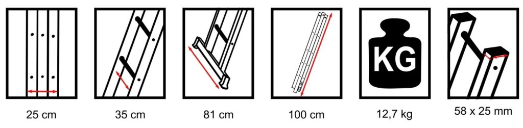 Wygodna drabina do długotrwałej pracy oraz częstego wchodzenia i schodzenia. Wyposażony w napęd górny i koła. Ilość stopni 6, max wysokość pionowa 2008 mm, szerokość zewnętrzna 380 mm, nośność 150 kg, gwarancja 10 lat.