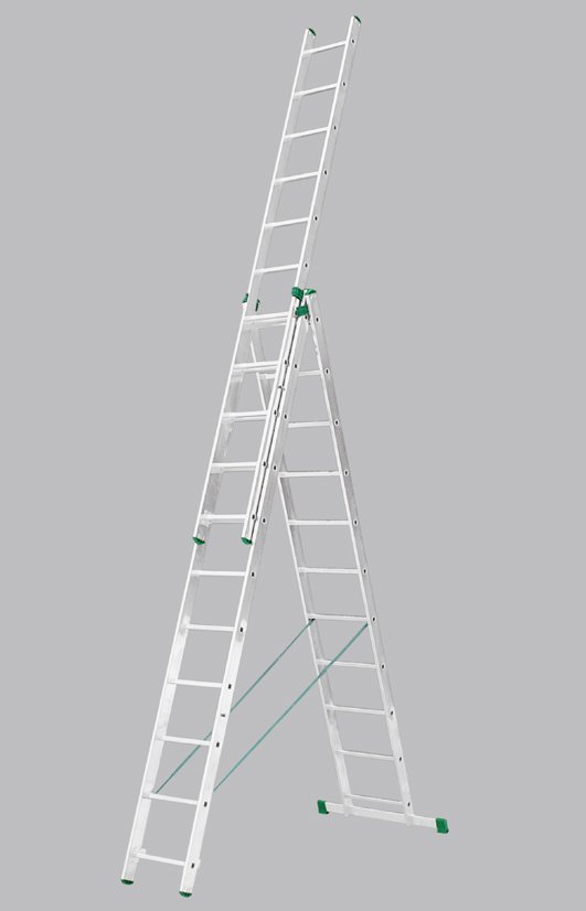 Trzyczęściowa uniwersalna drabina Eurostyle. Ilość przegród 3x10, max długość rozsuwana 6,26m, szerokość 454mm, końcówki zielono-czarne. Drabiny te są wykonane z lekkich materiałów, z naciskiem na lekkość i łatwość obsługi. Nadaje się do codziennego użytku w domu i firmach. Maksymalna ładowność 150 kg.