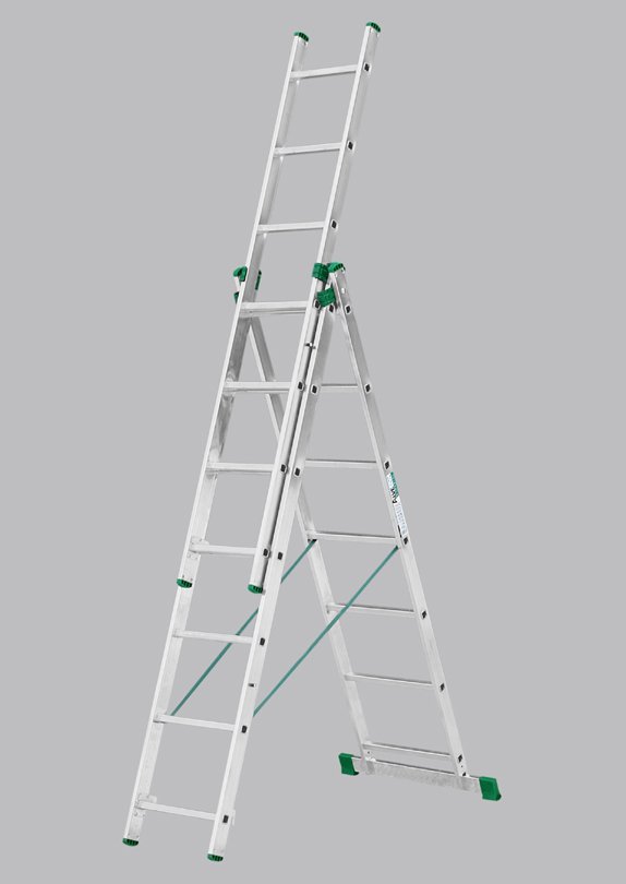 Trzyczęściowa uniwersalna drabina Eurostyle. Ilość przegród 3x9, max długość rozsuwana 5,69m, szerokość 454mm, końcówki zielono-czarne. Drabiny te są wykonane z lekkich materiałów, z naciskiem na lekkość i łatwość obsługi. Nadaje się do codziennego użytku w domu i firmach. Maksymalna ładowność 150 kg.