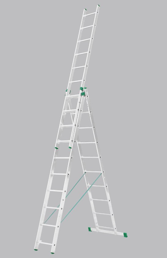 Trzyczęściowa uniwersalna drabina Eurostyle. Ilość przegród 3x7, max długość rozsuwana 3,99m, szerokość 454mm, końcówki zielono-czarne. Drabiny te są wykonane z lekkich materiałów, z naciskiem na lekkość i łatwość obsługi. Nadaje się do codziennego użytku w domu i firmach. Maksymalna ładowność 150 kg.