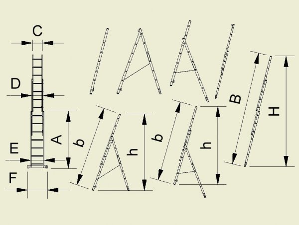Trzyczęściowa uniwersalna drabina Eurostyle. Ilość przegród 3x7, max długość rozsuwana 3,99m, szerokość 454mm, końcówki zielono-czarne. Drabiny te są wykonane z lekkich materiałów, z naciskiem na lekkość i łatwość obsługi. Nadaje się do codziennego użytku w domu i firmach. Maksymalna ładowność 150 kg.