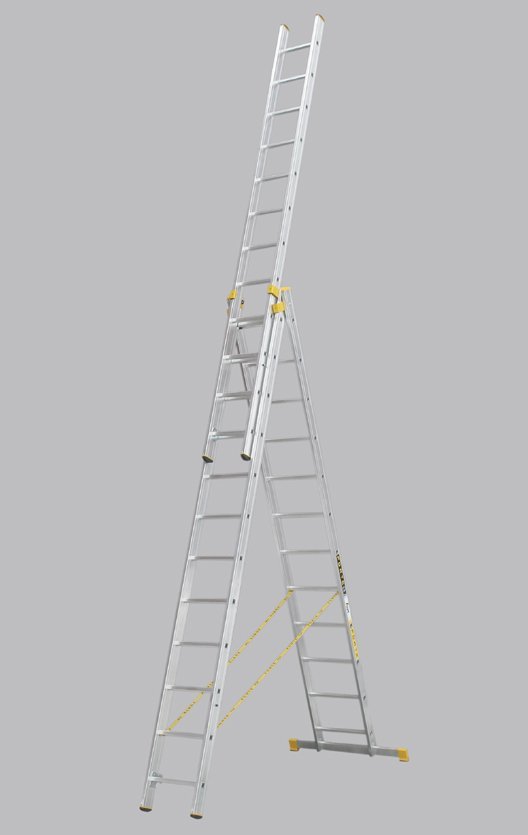 Drabina uniwersalna trzyczęściowa Forte. Ilość przegród 3x15, max długość rozsuwana 11,20 m, szerokość 484 mm, zakończenia żółto-czarne. Drabiny te zostały zaprojektowane tak, aby zapewnić wysoką trwałość i niezawodność przy jednoczesnym utrzymaniu możliwie najniższej wagi. Maksymalna ładowność 150 kg.