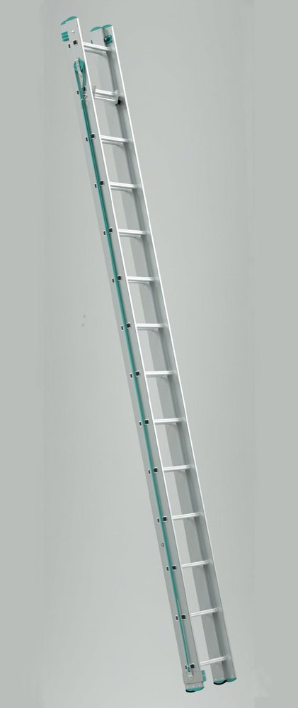 Dwuczęściowa, rozkładana drabina Eurostyle z liną. Ilość przegród 2x16, max długość rozsuwana 7,66m, szerokość 397 mm, końcówki zielono-czarne. Drabiny te są wykonane z lekkich materiałów, z naciskiem na lekkość i łatwość obsługi. Nadaje się do codziennego użytku w domu i firmach. Maksymalne obciążenie 150 kg. Lina umożliwia rozłożenie drabiny w pozycji pionowej.