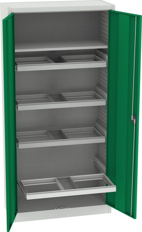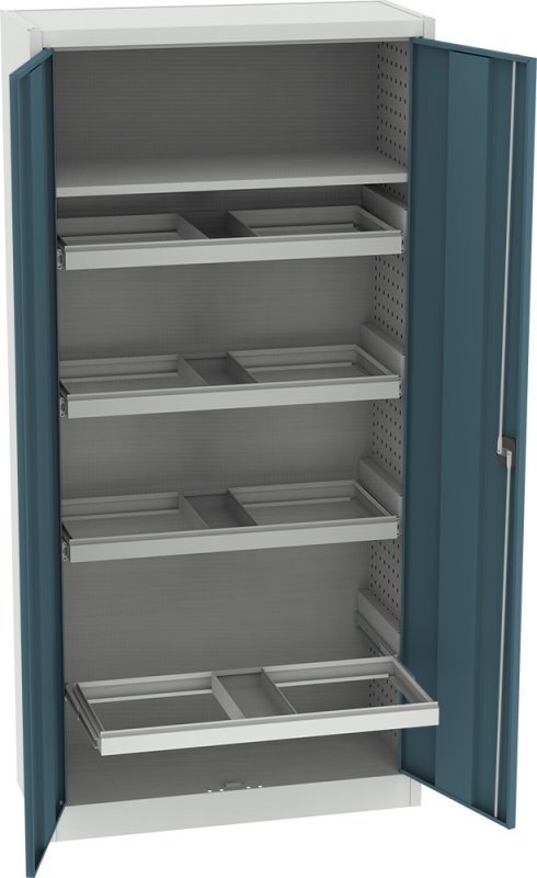 Szafa metalowa z drzwiami przesuwnymi, wys. 1950 x szer. 950 x gł. 400 mm, 4 regulowane półki. Drzwi przesuwne z zamkiem w kilku odcieniach kolorystycznych, korpus jasnoszary RAL 7035.