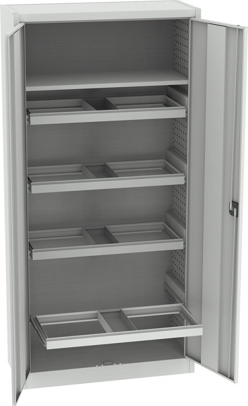 Dwudrzwiowa metalowa szafa z czterema wysuwanymi ramami i jedną półką. Wymiary wysokość 1950 x szerokość 950 x głębokość 400 mm. Blokowanie za pomocą cylindrycznej blokady rozstawu osi. Kolor korpusu jasnoszary.