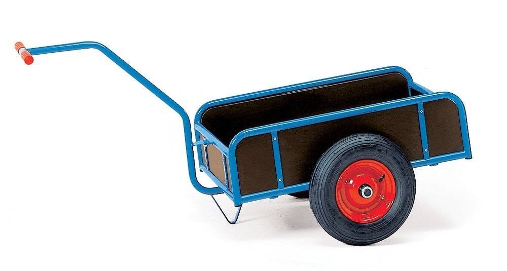 Wózki platformowe z uchwytem wyprodukowane w Niemczech, konstrukcja stalowa, drewniana powierzchnia ładunkowa, 4 specjalne koła pneumatyczne Fetra TPE, z czego 2 obrotowe z hamulcem, 2 stałe.