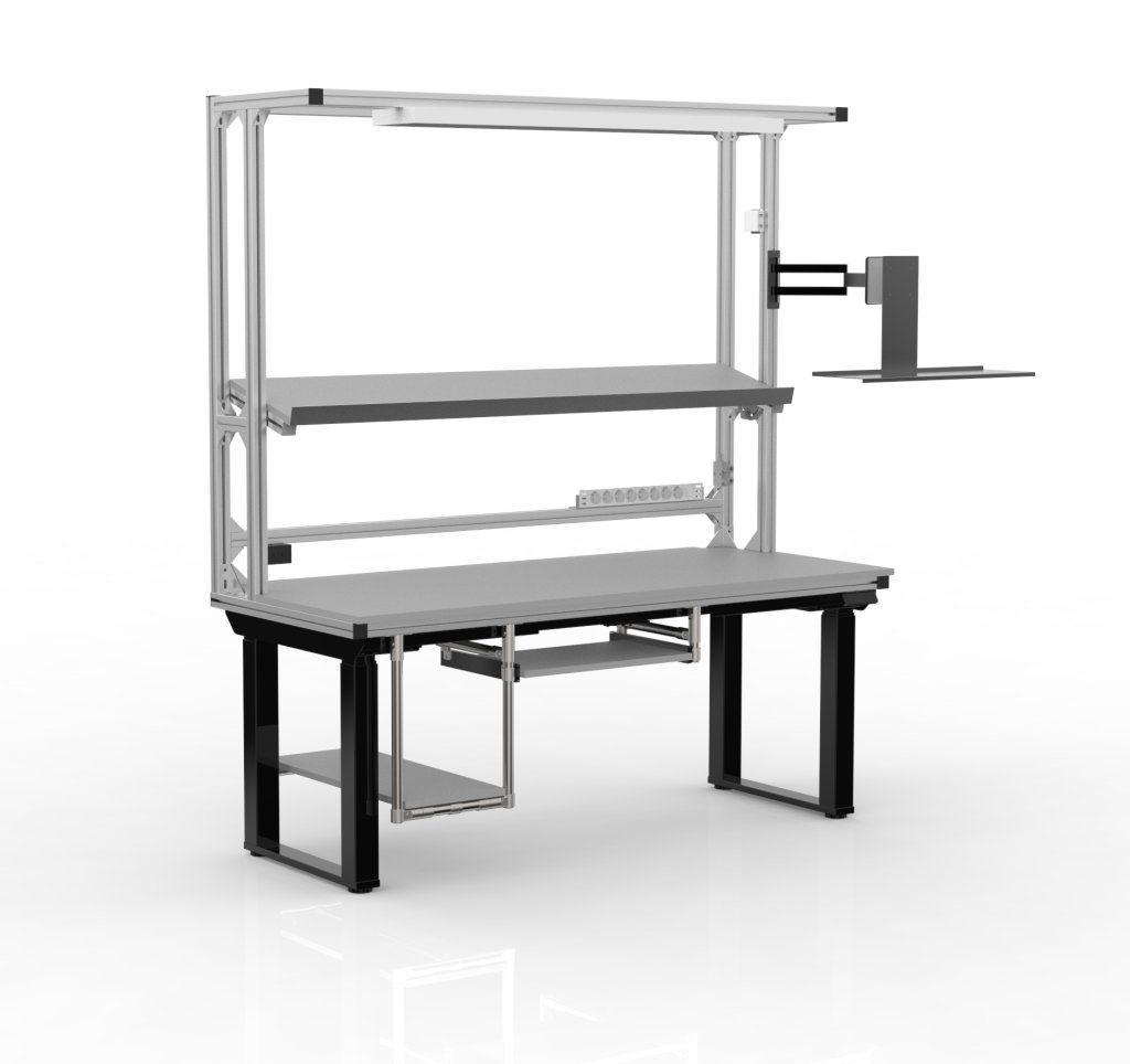 Elektronicznie regulowany na wysokość stół warsztatowy z nożem. Stół wyposażony jest w blat roboczy z drewna bukowego klejonego, podwieszany kontener z dwiema szufladami, tablica perforowana do zawieszania skrzynek lub narzędzi, przecinarka, ocynkowana półka z przegrodą, uchwyt na monitor oraz oświetlenie LED. Wysokość roboczej powierzchni regulowana w zakresie 732 - 1382 mm. Nośność przy równomiernym obciążeniu wynosi 250 kg, a nośność półki 75 kg. Wymiary: 1883 - 2533 x 1573 x 765 mm.