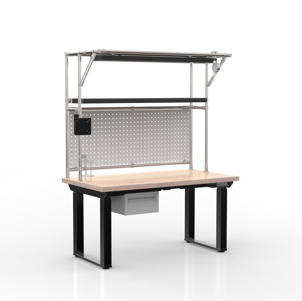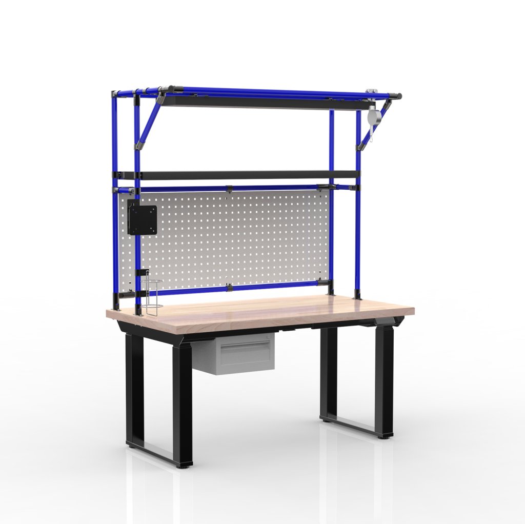 Elektronicznie regulowany na wysokość stół warsztatowy z nadbudową z profili aluminiowych. Stół zawiera blat roboczy z laminatu o grubości 18 mm, dwie podwieszane półki, uchwyt na monitor i klawiaturę, regulowaną półkę z zabezpieczeniem przeciwko przewróceniu, oświetlenie LED. Wysokość roboczej powierzchni regulowana w zakresie 717 - 1367 mm. Całkowita nośność przy równomiernym obciążeniu wynosi 200 kg, nośność półki 50 kg, nośność blatu roboczego 150 kg. Wymiary: 2000 - 2650 x 1750 x 750 mm.