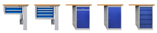 Stoły mogą być wyposażone w różne kontenerki do przechowywania z zamykanymi szufladami lub drzwiczkami.