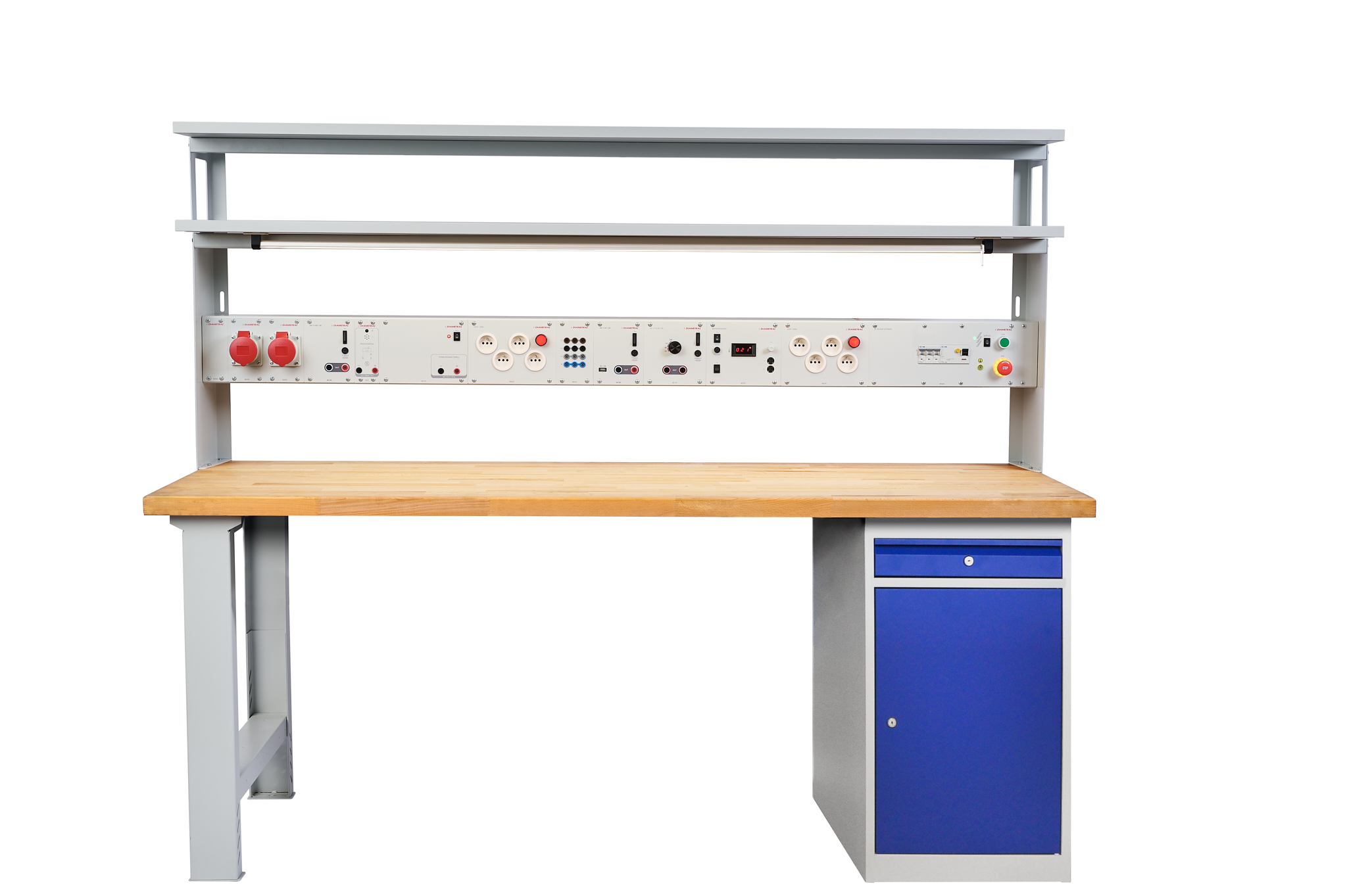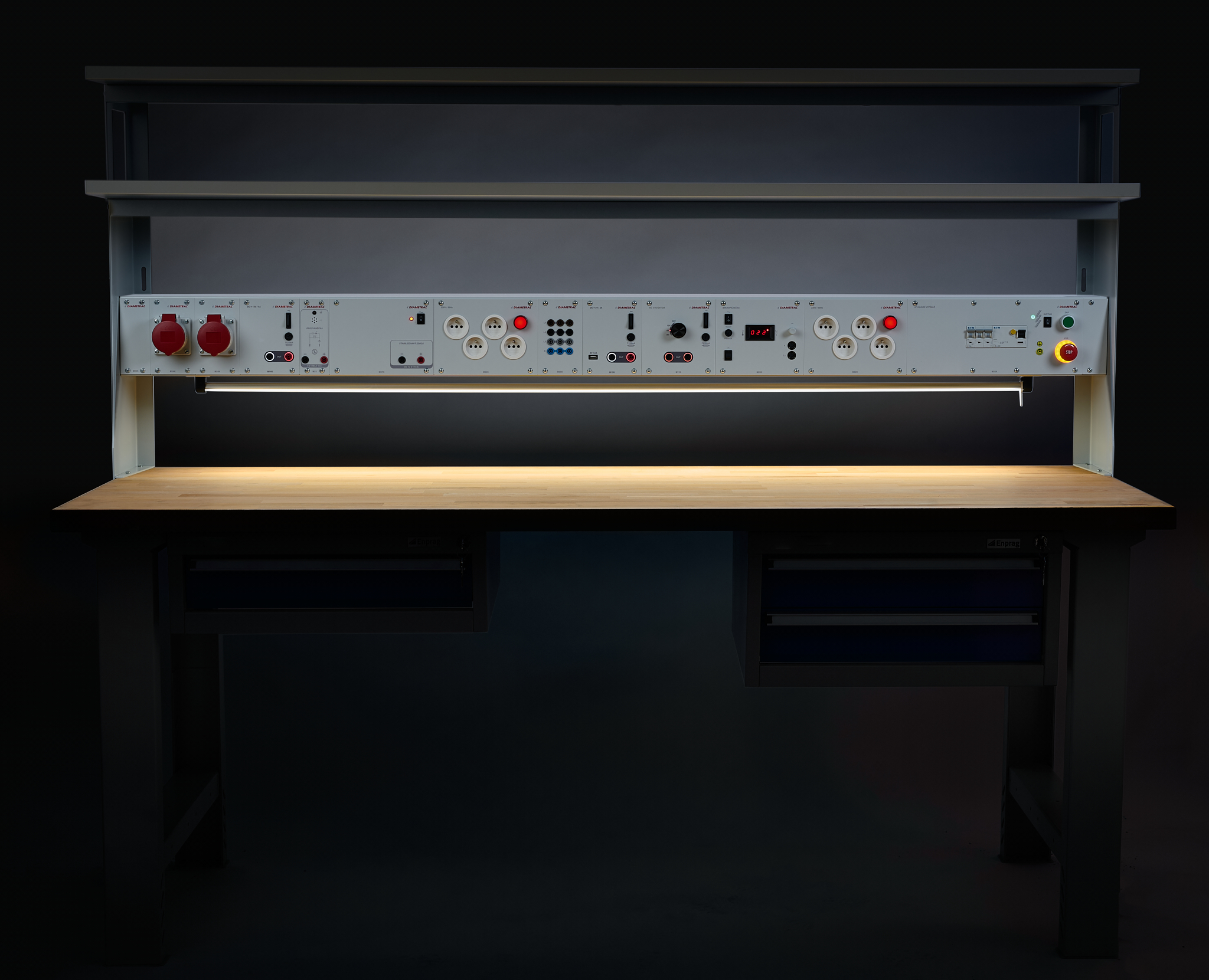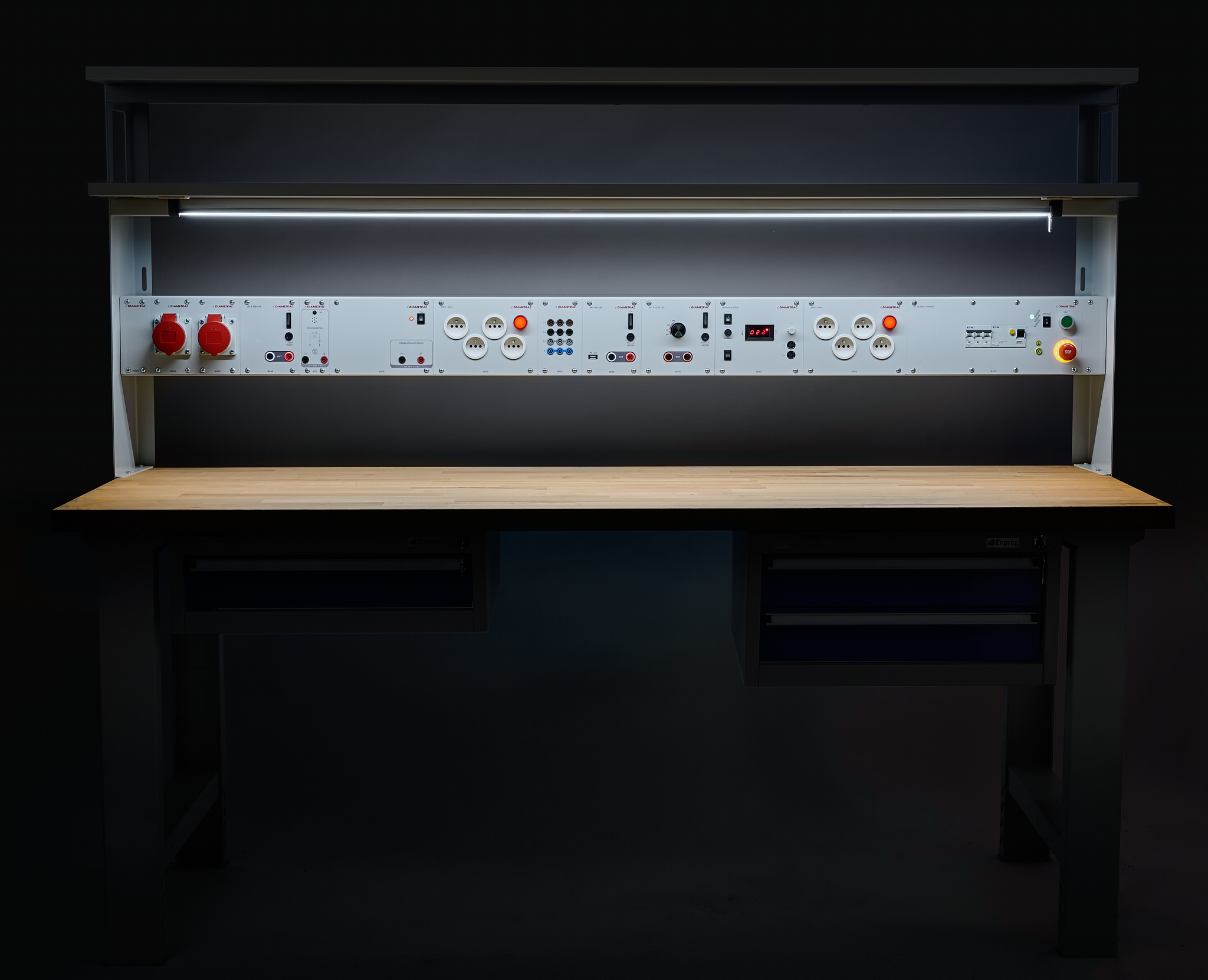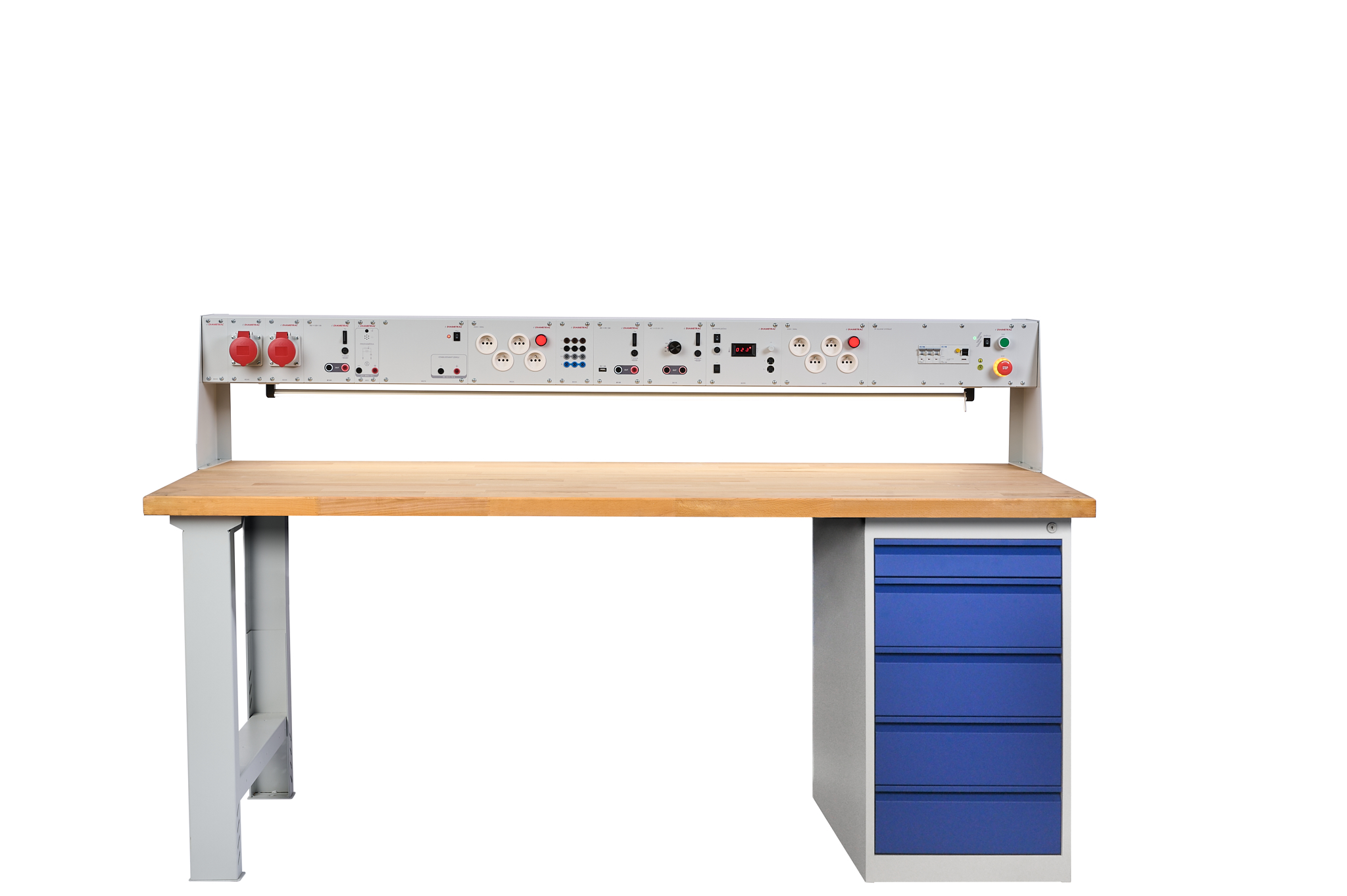 Stoły robocze ELWork to idealne rozwiązanie dla stanowisk pracy, które potrzebują łączyć prace elektrotechniczne i mechaniczne w jednym miejscu. Podstawa stołu to wytrzymała stalowa konstrukcja, a blat roboczy wykonany jest z litego drewna bukowego. Wyposażenie elektromechaniczne stanowiska pracy jest przejrzyście i bezpiecznie zintegrowane w listwie urządzeń.