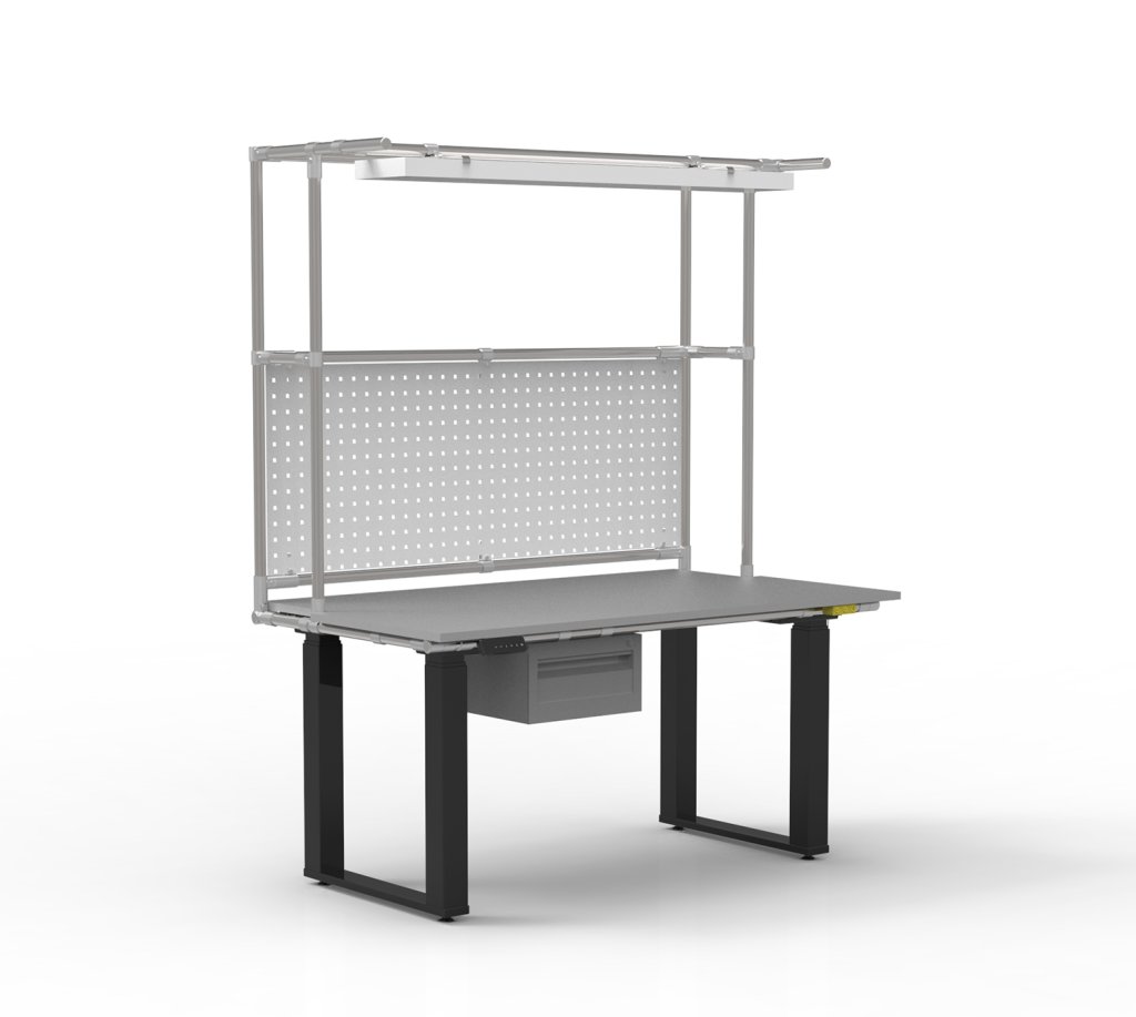 Ergonomiczny stół ESD do stanowisk chronionych elektrostatycznie z praktyczną nadstawką z systemu rurowego. W skład stołu wchodzi oświetlenie LED, panel perforowany oraz kontener z jedną szufladą. Stół jest wyposażony w intuicyjny sterownik z możliwością zapisania trzech zaprogramowanych wysokości, co ułatwia ergonomiczne ustawienie powierzchni roboczej w zakresie 680 – 1330 mm.