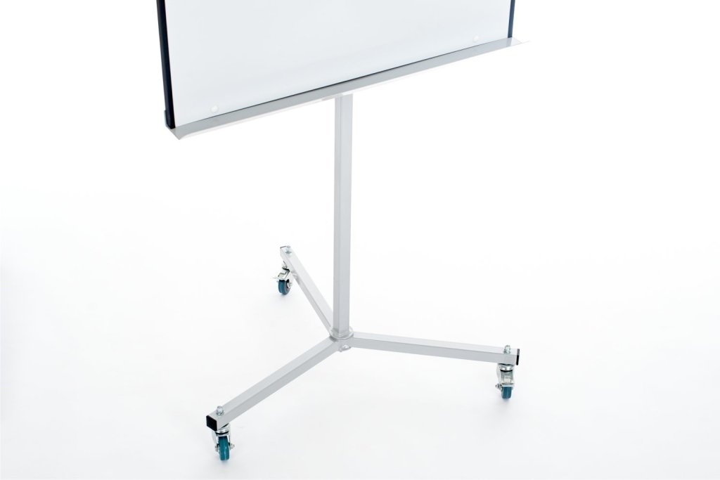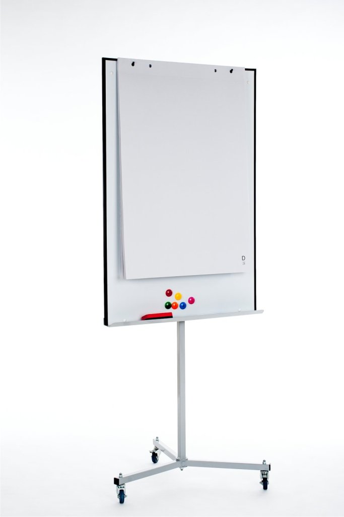 Mobilny, składany flipchart. Tablica z powierzchnią magnetyczną. Na statywie z trzema kółkami i ręcznie regulowaną wysokością. Haczyki do wieszania kartek papieru, stała półka na markery. Powierzchnia magnetyczna odpowiednia dla wszystkich markerów suchościeralnych. Wysokość tablicy można regulować w zakresie od 105 do 184 cm.