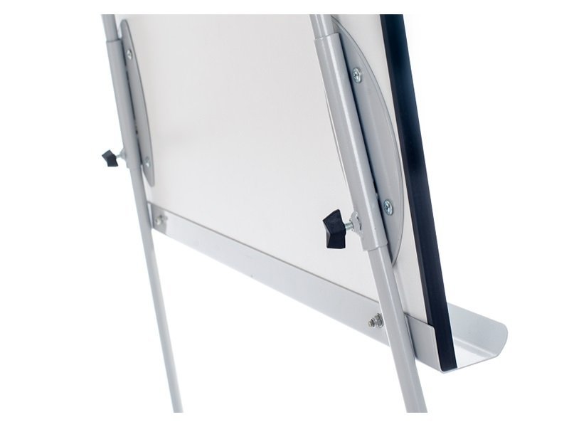 Lakierowana na biało tablica magnetyczna na statywie. Deska ma regulowaną wysokość. Rozmiar 100 x 150 cm. W zestawie szyna do przechowywania markerów, szyna do mocowania bloków papieru i ramiona do wieszania arkuszy papieru.