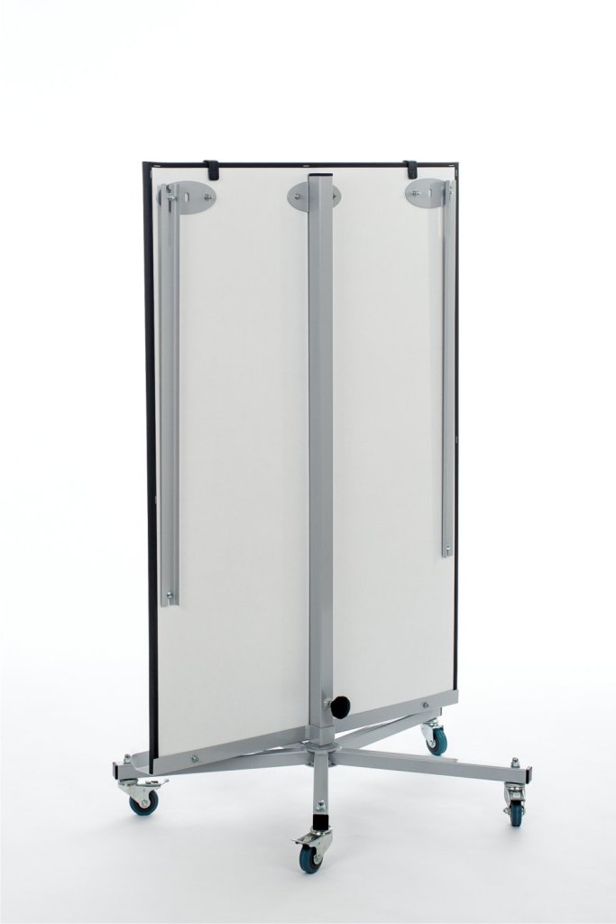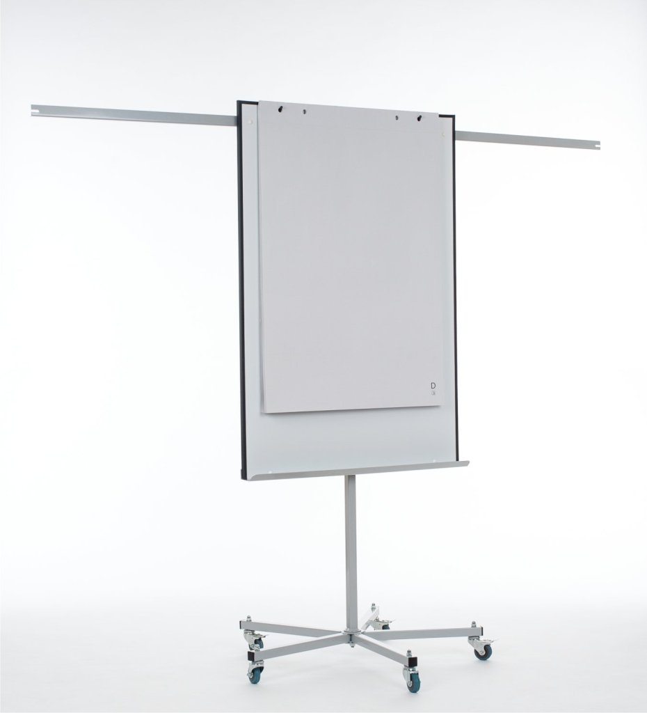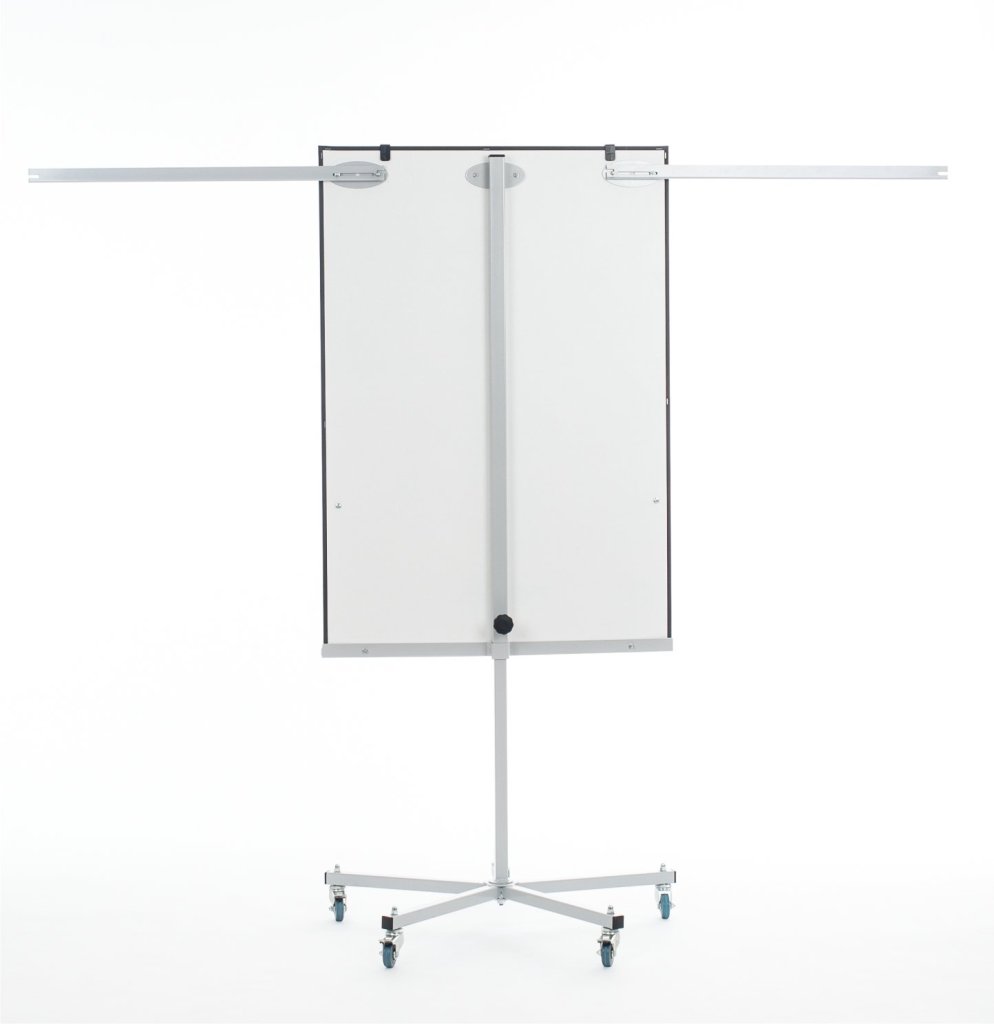 Lakierowana na biało tablica magnetyczna na statywie. Deska ma regulowaną wysokość. Rozmiar 100 x 150 cm. W zestawie szyna do przechowywania markerów, szyna do mocowania bloków papieru i ramiona do wieszania arkuszy papieru.