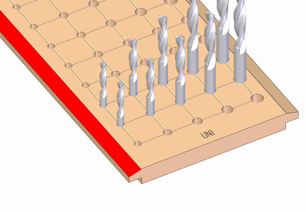 Pro skladování drobnějších obráběcích nástrojů a jejich komponent využijte dřevěné držáky. Dřevo je pro bezpečné skladování přesných nástrojů velmi vhodné. Vlastní držák nástrojů je vyráběn nejmodernější technologií z vysoce kvalitní bukové překližky. V čelní ploše je vlepený plastový popisovací štítek. Součástí kompletního držáku je plechová vanička se sorpční textilií pro zachycování emulzí a olejů. Vanička současně plní funkci dna (opory) pro nástroje, které by mohly propadnout skrz dřevěný držák (viz obrázek).