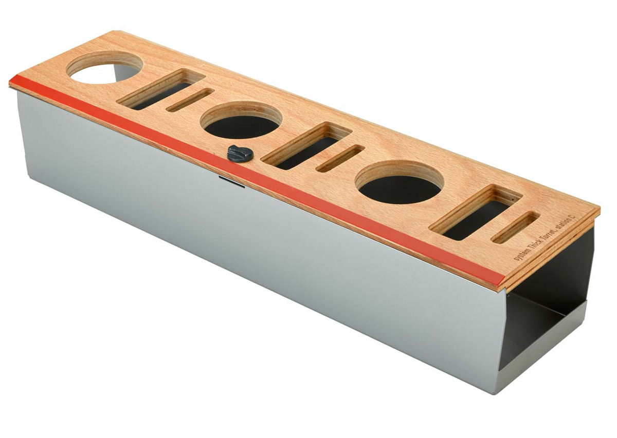 Systém Thick Turret: Pro skladování děrovacích nástrojů systému Thick Turret je určen systém dřevěných držáků. Dřevo je pro bezpečné skladování přesných nástrojů velmi vhodné. Vlastní držák nástrojů je vyráběn nejmodernější technologií z vysoce kvalitní bukové překližky. V čelní ploše je vlepený plastový popisovací štítek. Součástí kompletního držáku je plechová vanička se sorpční textilií pro zachycování emulzí a olejů. Vanička současně plní funkci dosedací plochy pro nástroje (viz obrázek).
