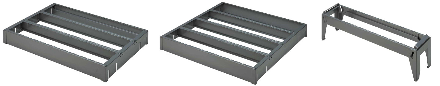 Nástrojové rámy pro zásuvky rozšiřují možnosti ukládání nástrojů v rámci celého stavebnicového nábytkového systému POLAK. Protože nástroje a upínací trny nástrojů jsou různě dlouhé, je možné nástrojové rámy v zásuvkách výškově nastavovat. Nástrojový rám je v zásuvce zavěšen pomocí sady čtyř držáků, které jsou součástí dodávky nástrojového rámu.