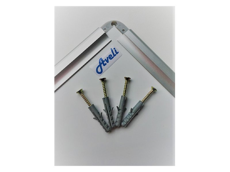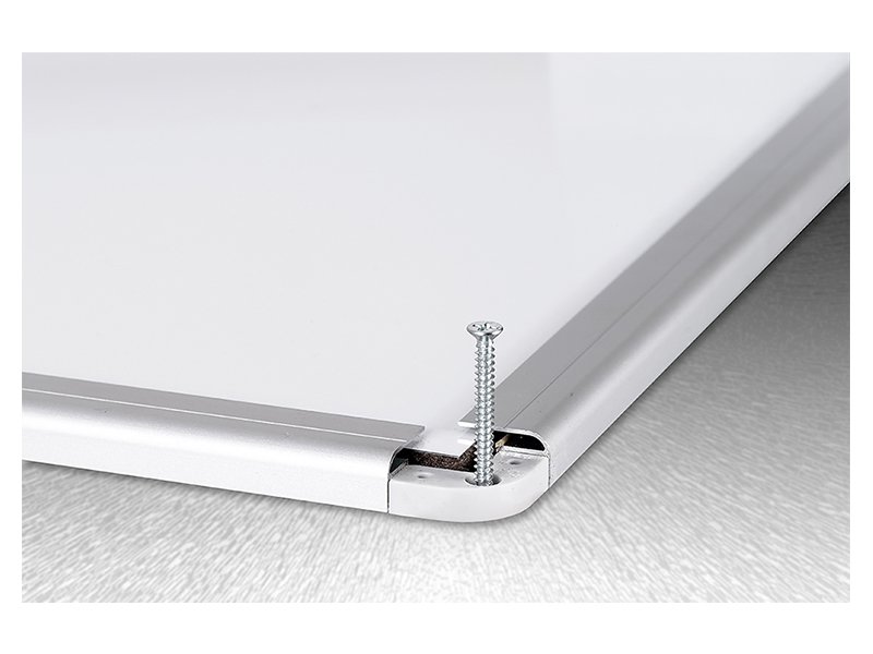 Jednoczęściowa ceramiczna tablica suchościeralna z anodowaną aluminiową ramą. Zawiera półkę do przechowywania markerów. W zestawie zestaw do montażu na ścianie.