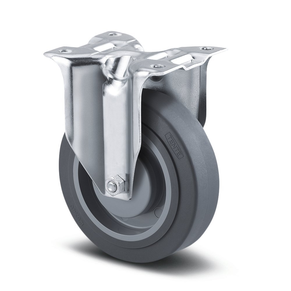 Koło przyrządowe stałe o średnicy 125 mm, widełki wykonane ze stali tłoczonej, ocynkowanej, tor kulkowy dwurzędowy w głowicy skrętnej, koło mocowane śrubą z nakrętką, osłona przeciwfilcowa, mocowanie za pomocą płytki. Piasta koła z polipropylenu, bieżnik z szarego TENTEprenu (kauczuku termoplastycznego), precyzyjne łożysko kulkowe.