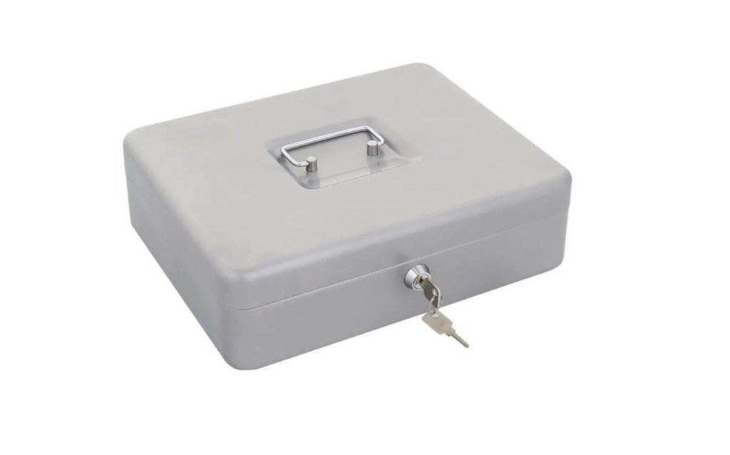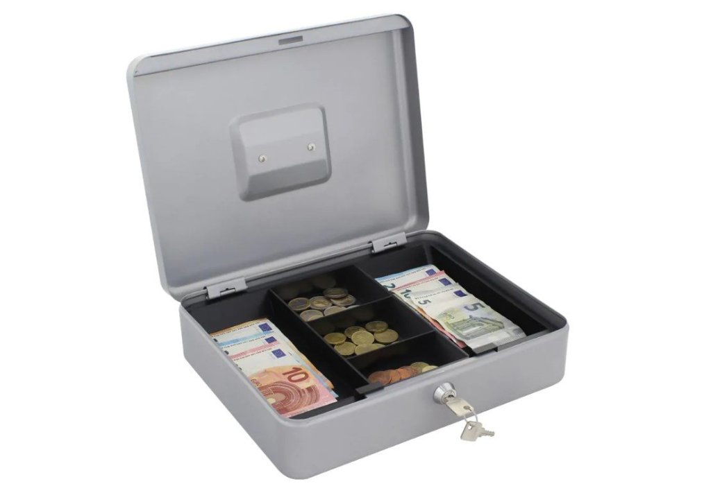 Kasetka do kasy fiskalnej, obsługa manualna, z wkładem na monety i banknoty. Blokowanie kluczem.