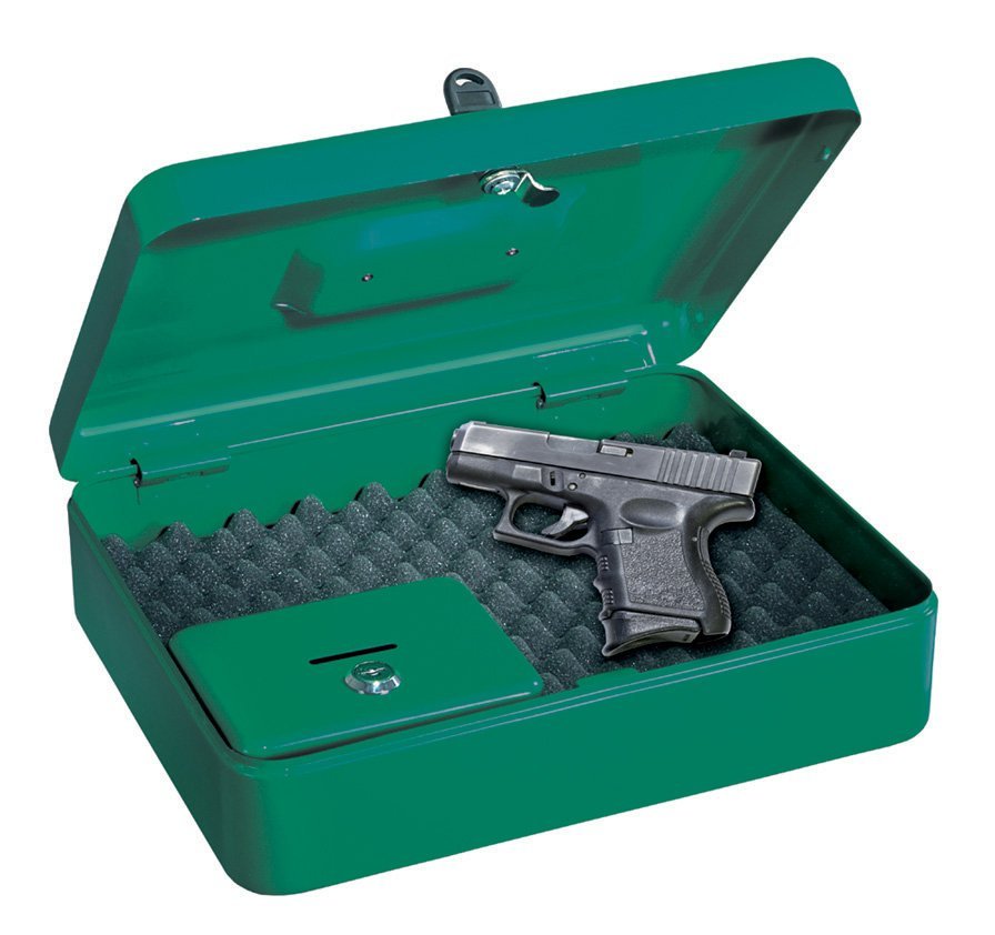 Kasetka na broń krótką wykonana z wysokiej jakości blachy, uchwyt niklowany, zamykana. Wysokość 90 x szerokość 300 x głębokość 240 mm. Kolor RAL 6002 zielony.