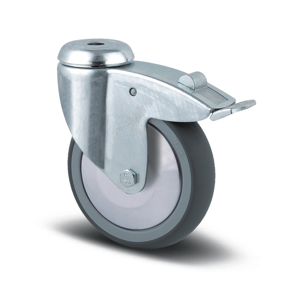 Koło przyrządowe obrotowe ø 125 mm z hamulcem całkowitym, widełki z tłoczonej stali, podwójne łożysko kulkowe w głowicy obrotowej, mocowanie z płytką. Środek koła wykonany z polipropylenu, bieżnik z szarego TENTEprenu (kauczuku termoplastycznego), łożysko ślizgowe.