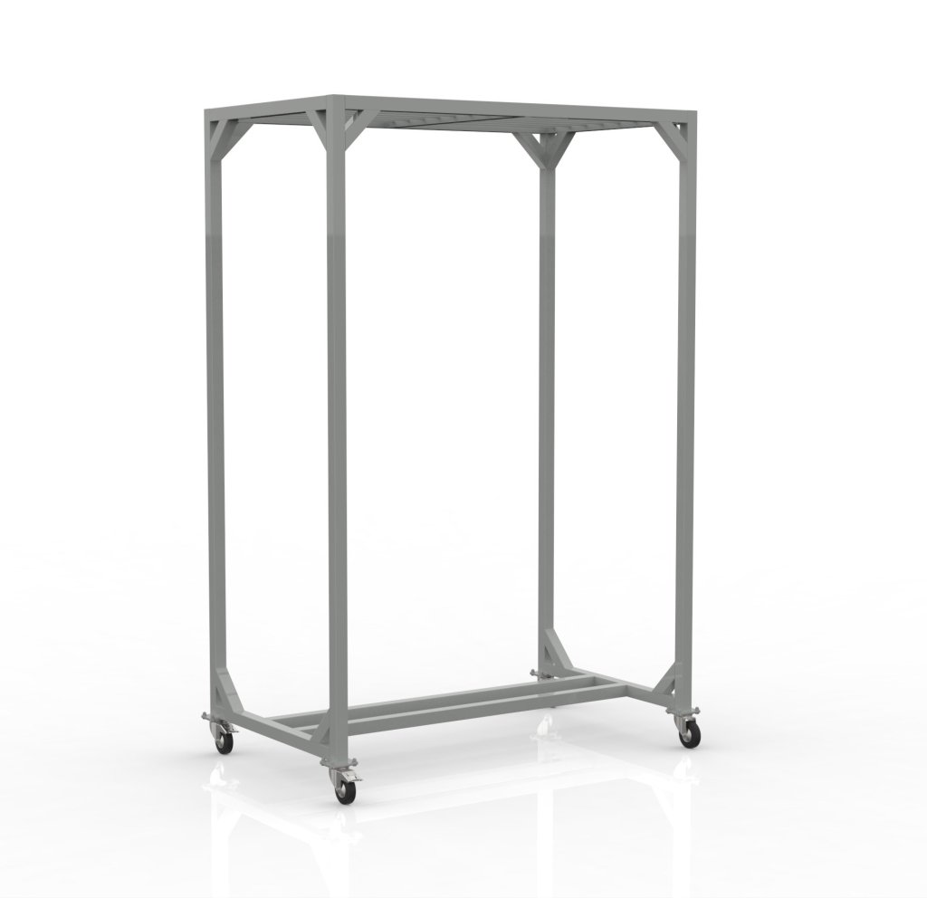 Spawana konstrukcja do zawieszania. Ta solidna konstrukcja jest idealnym rozwiązaniem dla zastosowań przemysłowych, gdzie konieczne jest zapewnienie bezpiecznego transportu części, np. po obróbce cieplnej. Spawana konstrukcja stalowa o wymiarach 45 x 45 mm pokryta jest szarym lakierem. Zawiera 2 kółka z hamulcem i 2 kółka bez hamulca o średnicy 100 mm. Nośność wynosi 500 kg. Wymiary 2300 x 1500 x 900 mm.