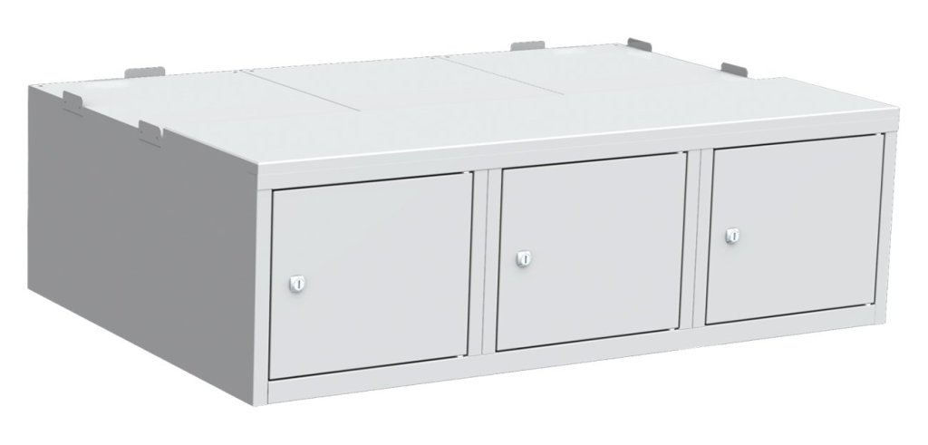 Cokół szafy z trzema drzwiami, szerokość 900, wysokość 370, głębokość 810 mm. Kolor korpusu RAL 7035 jasnoszary.
