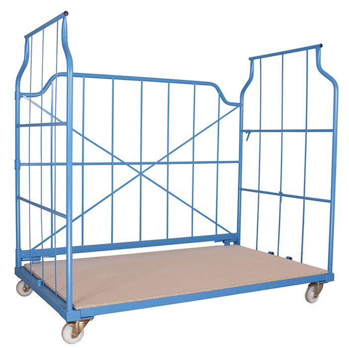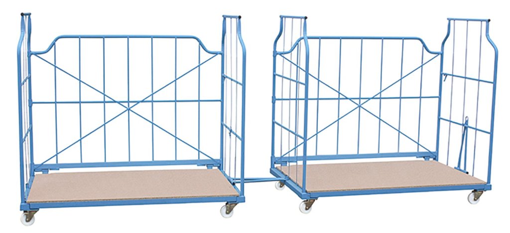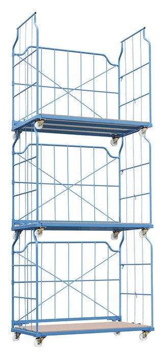 Mobilny kontener z trzema ścianami kratowymi - Standard Corlette®, który można ustawiać jeden na drugim. Wymiary wysokość 1800 x szerokość 1300 x głębokość 1150 mm. Do przechowywania i przewożenia towarów duzych gabarytów. Możliwość sztaplowania na 3 poziomach wysokości, dzięki czemu możesz w pełni wykorzystać przestrzeń do przechowywania. Łatwa obsługa dzięki plastikowym kółkom (1x hamowane). Kolor RAL 5012. Na zamówienie istnieje możliwość modyfikacji wózków według Państwa życzeń!