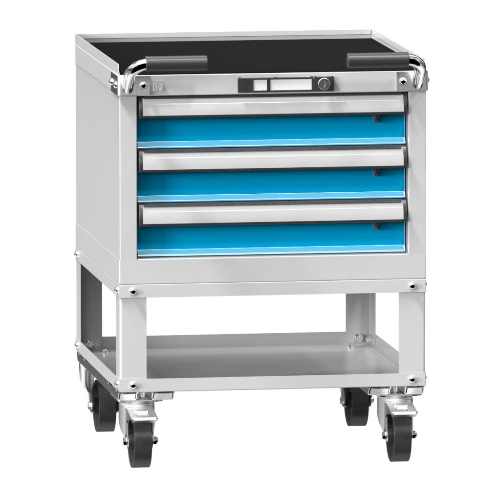 Kontener mobilny, wysokość 808, szerokość 1037, głębokość 630 mm. 3x szuflada, 2x kółka stałe z polipropylenu 160 mm, 2 kółka skrętne z polipropylenu 160 mm z hamulcem, podwyższona krawędź 20 mm + mata gumowa, uchwyty stałe. Wymiary wewnętrzne szuflady 918 x 459 mm.
