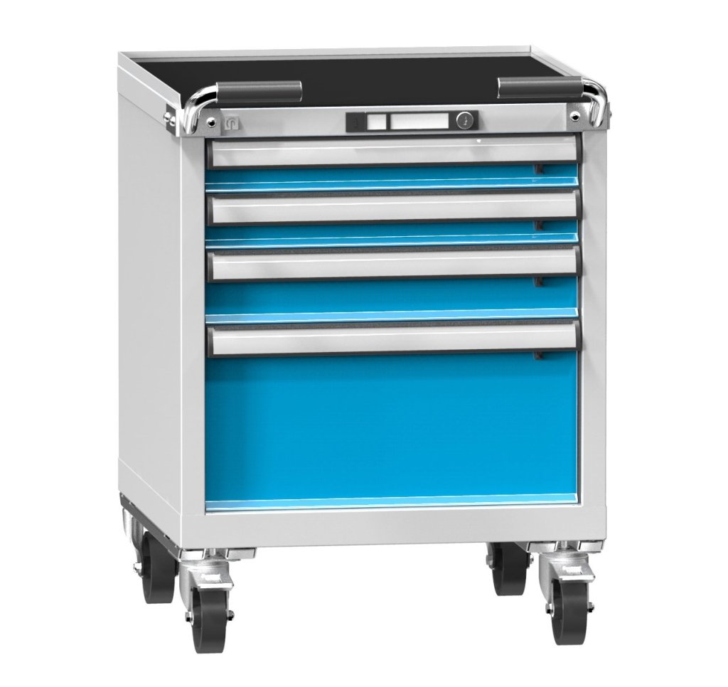 Kontener mobilny, wysokość 738, szerokość 578, głębokość 600 mm. 4x szuflada, 2x kółka stałe z polipropylenu 100 mm, 2 kółka skrętne z polipropylenu 100 mm z hamulcem, podwyższona krawędź 20 mm + mata gumowa, uchwyty stałe. Wymiary wewnętrzne szuflady 459 x 459 mm.