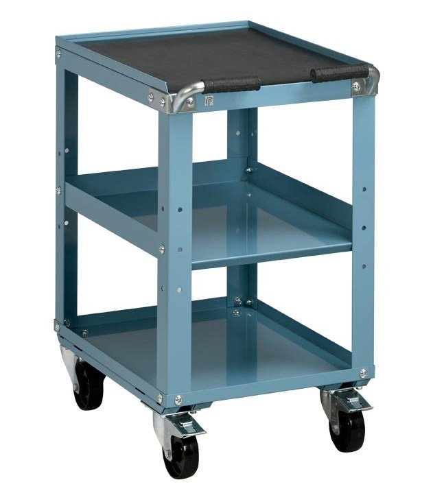 Kontener mobilny, wysokość 738, szerokość 442, głębokość 630 mm. 2x półki, 2x kółka stałe z polipropylenu 100 mm, 2x kółka skrętne z polipropylenu 100 mm z hamulcem, podwyższona krawędź 20 mm + mata gumowa, uchwyty stałe.
