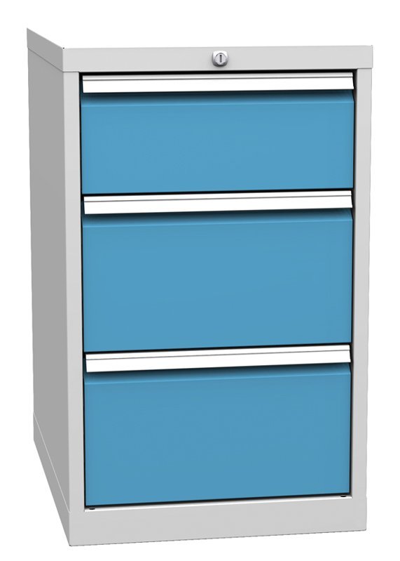 Pojemnik warsztatowy z trzema szufladami, szerokość 500, wysokość 810, głębokość 700 mm. 1x nasadka 180, 2x 240 mm. Kolor korpusu RAL 7035 jasnoszary. Na stanie w kolorze korpusu jasnoszarym, szuflady w kolorze niebieskim.